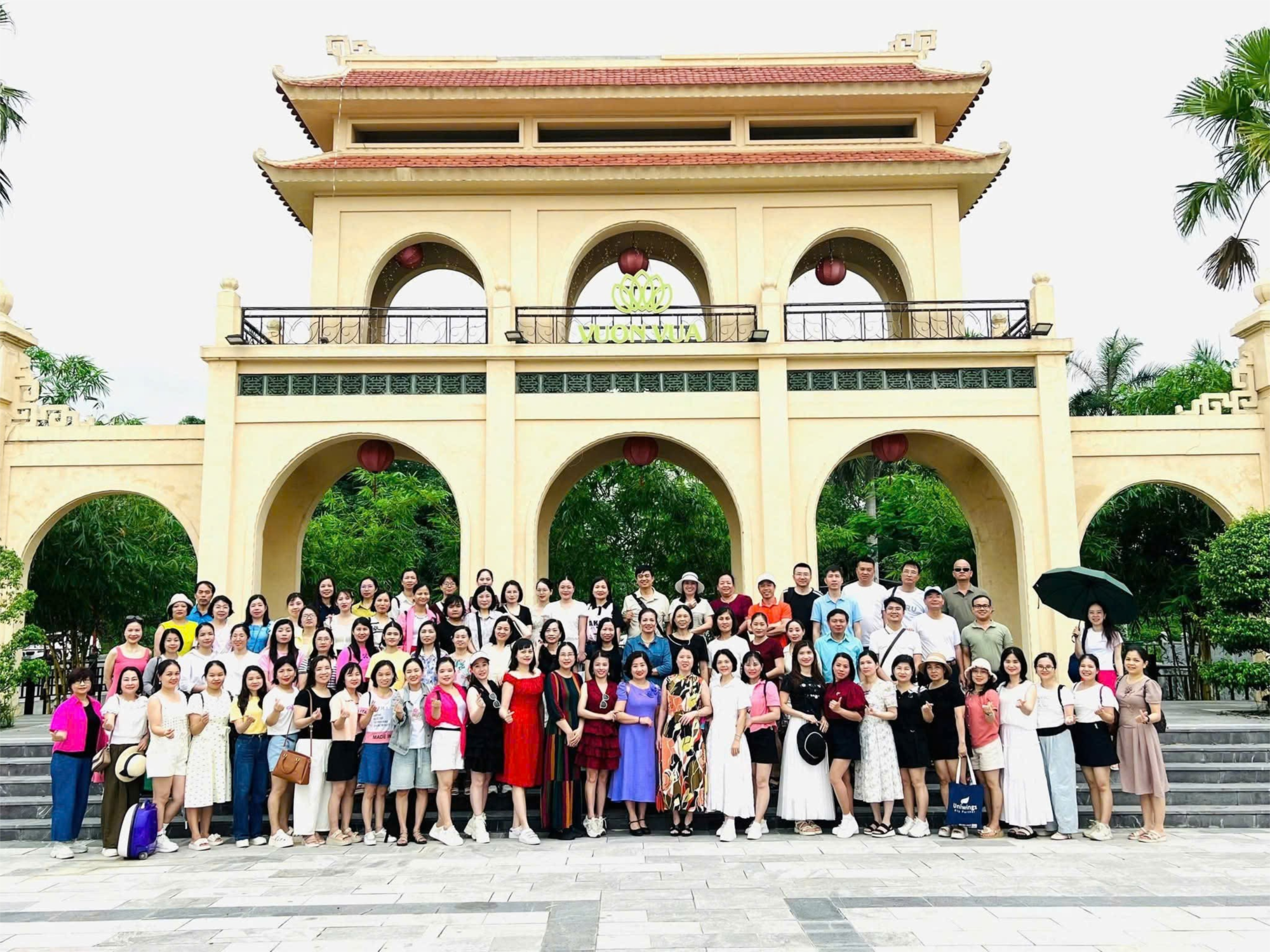 Đoàn tham quan chụp ảnh lưu niệm tại cổng vào khu du lịch Vườn Vua