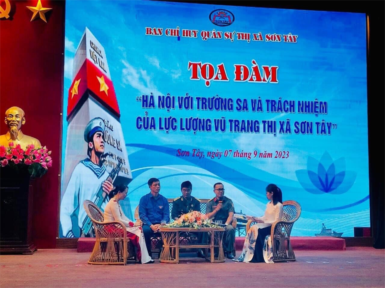 Nhằm góp phần giáo dục lòng yêu nước và nâng cao nhận thức, hiểu biết về lực lượng vũ trang và chủ quyền, tình hình biển, đảo Việt Nam. Chiều ngày 07/9/2023, cô giáo Phạm Thị Huyền - Phó Bí thư chi bộ, phó hiệu trưởng nhà trường, thầy giáo Nguyễn Văn Khang - Giáo viên GDQP với vai trò khách mời chia sẻ tại tọa đàm cùng đoàn viên Phan Thị Mỹ Uyên - Đại diện thanh, thiếu niên thị xã Sơn Tây và 50 bạn đoàn viên, thanh niên trường THPT Sơn Tây đã tham dự và chia sẻ ý kiến, quan điểm cũng như lắng nghe những câu chuyện của các chiến sĩ hải đảo tại tọa đàm “Hà Nội với Trường Sa và trách nhiệm của lực lượng vũ trang thị xã Sơn Tây”. Đây là hoạt động ý nghĩa giúp các đoàn viên, thanh niên nhận thức được trách nhiệm của lực lượng vũ trang, tầm quan trọng của biển, đảo trong sự nghiệp xây dựng, phát triển đất nước.