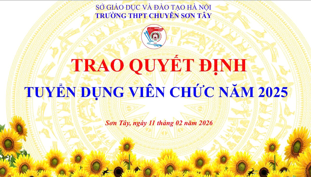 Căn cứ công văn số 496/SGDĐT – TCCB của Sở Giáo dục và đào tạo Hà Nội ngày 06 tháng 02 năm 2026 về việc hướng dẫn tiếp nhận viên chức trúng tuyển năm 2025, trong không khí vui tươi, phấn khởi của những ngày đầu xuân Bính Ngọ 2026, hòa cùng niềm tự hào kỷ niệm 96 năm Ngày thành lập Đảng Cộng sản Việt Nam (03/02/1930 – 03/02/2026), ngày 11 tháng 02 năm 2026, Trường THPT chuyên Sơn Tây đã long trọng tổ chức Hội nghị trao Quyết định tuyển dụng viên chức năm 2025, sự kiện có ý nghĩa đặc biệt, đánh dấu bước mở đầu quan trọng trong hành trình nghề nghiệp của các giáo viên trúng tuyển.