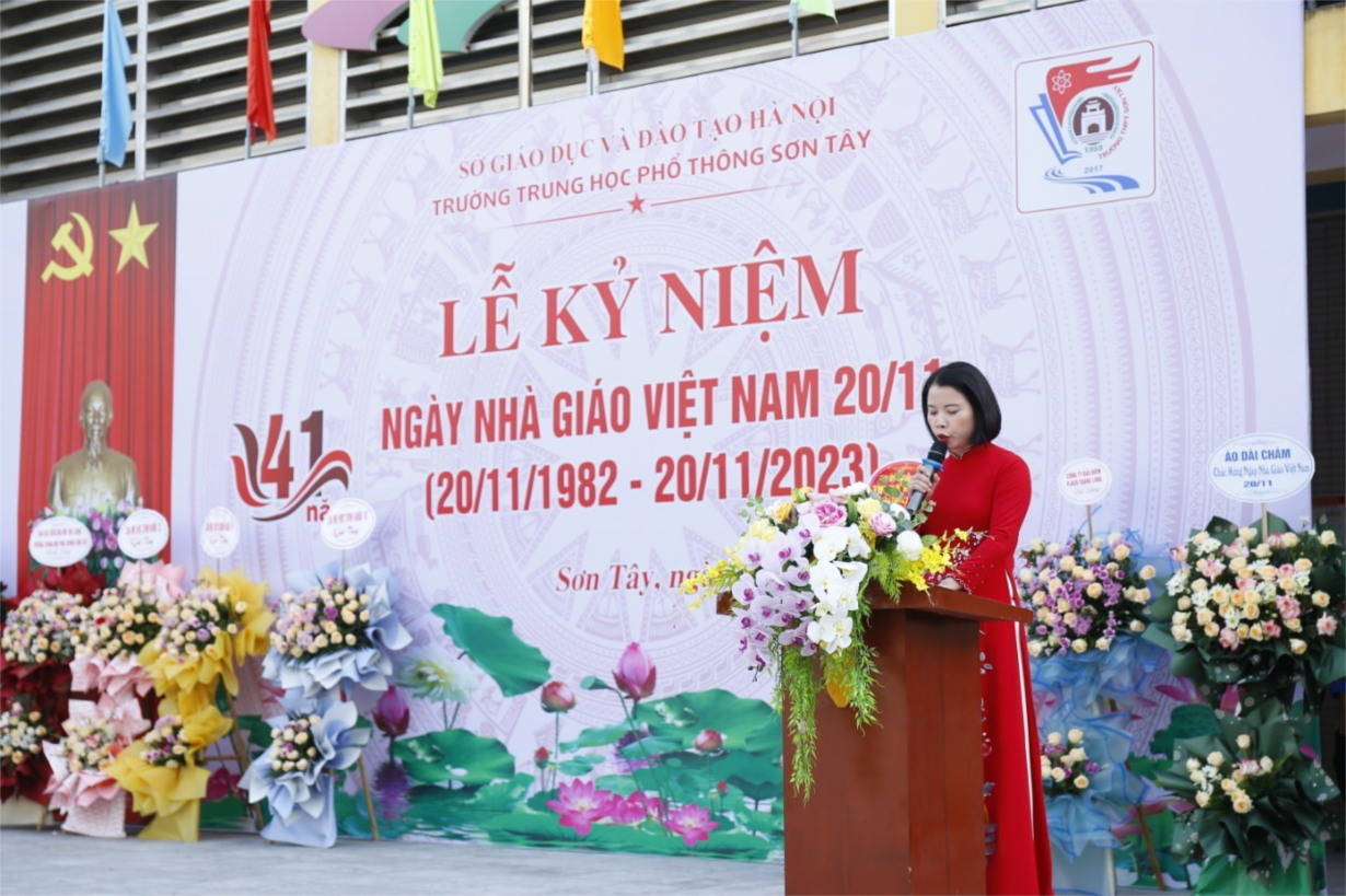 Hòa chung với không khí phấn khởi chào mừng kỷ niệm 41 năm Ngày nhà giáo Việt Nam 20/11, cùng với các nhà trường trong cả nước, trường THPT Sơn Tây long trọng tổ chức kỷ niệm Ngày nhà giáo Việt Nam và tuyên dương khen thưởng các tập thể, cá nhân xuất sắc trong năm học 2022 - 2023. Đến dự Lễ kỷ niệm với nhà trường có các đồng chí lãnh đạo Thị ủy, HĐND-UBND thị xã Sơn Tây, các đồng chí đại diện cho các cơ quan, ban ngành, đoàn thể trong thị xã, các nhà giáo nguyên là giáo viên của trường THPT Sơn Tây đã nghỉ hưu, các bậc phụ huynh đại diện cho chi hội các lớp và toàn thể các CB, GV, NV nhà trường cùng 1.753 học sinh của các khối lớp.