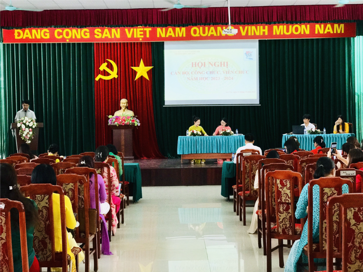 Sau phần nghi lễ, tuyên bố lý do, giới thiệu đoàn chủ tịch, đoàn thư ký là những nội dung: Báo cáo kết quả thực hiện nhiệm vụ năm học 2022 - 2023 và kế hoạch nhiệm vụ, chỉ tiêu, biện pháp thực hiện trong năm học 2023 - 2024; Thông qua quy chế phối hợp giữa công đoàn và nhà trường; Các tham luận tại Hội nghị (3 tham luận); Giải đáp thắc mắc, kiến nghị, tiếp thu ý kiến của các đồng chí CBGV-NV; Thông qua quy định xếp loại thi đua và phát động thi đua trong cơ quan; Báo cáo tổng kết công tác Ban Thanh tra nhân dân năm học 2022 - 2023; Thông qua chỉ tiêu năm học mới và biểu quyết, thông qua biên bản Hội nghị; Bế mạc Hội nghị.