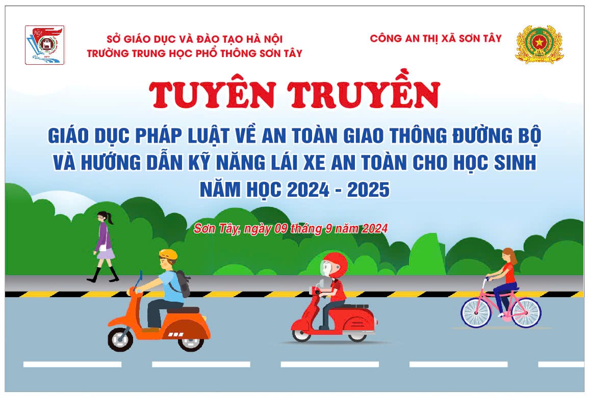 Thực hiện quy chế phối hợp giữa Công an Thành phố Hà Nội và Sở Giáo dục Đào tạo về công tác bảo đảm an ninh trật tự, an toàn tại các cơ sở giáo dục trên địa bàn nhằm nâng cao ý thức chấp hành pháp luật của học sinh, ngày 09/09/2024, Trường THPT Sơn Tây đã phối hợp với đội Cảnh sát giao thông - công an thị xã Sơn Tây tổ chức buổi tuyên truyền giáo dục pháp luật về an toàn giao thông (ATGT) đường bộ và hướng dẫn kỹ năng lái xe an toàn cho học sinh. Tới dự buổi tuyên truyền có sự góp mặt của cô giáo Phạm Thị Huyền, phó bí thư chi bộ, phó hiệu trưởng phụ trách nhà trường, Trung tá Vương Sỹ Thành – cán bộ đội Cảnh sát quản lý hành chính về trật tự xã hội – công an thị xã Sơn Tây, Đại úy Phạm Văn Hùng – cán bộ đội cảnh sát giao thông – công an thị xã Sơn Tây cùng toàn thể cán bộ, giáo viên và học sinh trường THPT Sơn Tây.