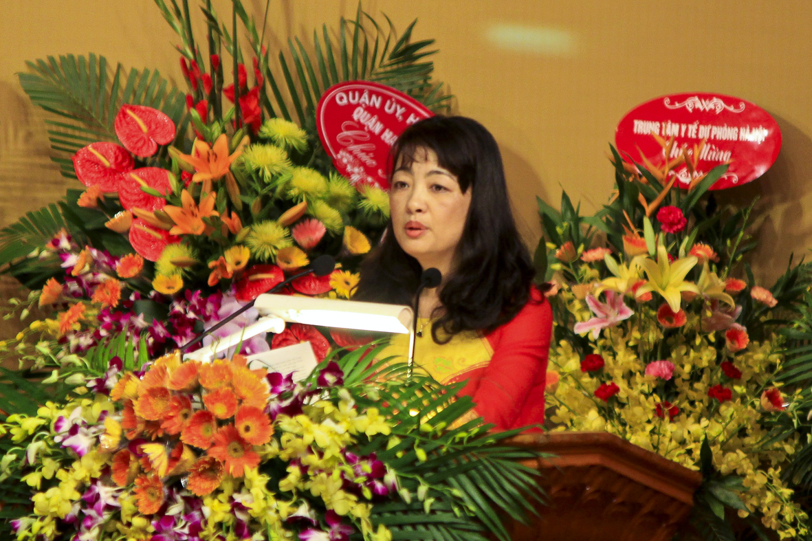 Đc: Lương Quỳnh Lan - Hiệu trưởng trường THPT Sơn Tây phát tại lễ kỷ niệm ngày NGVN và tuyên dương những điển hình tiên tiến tiêu biểu ngành giáo dục thủ đô năm 2015