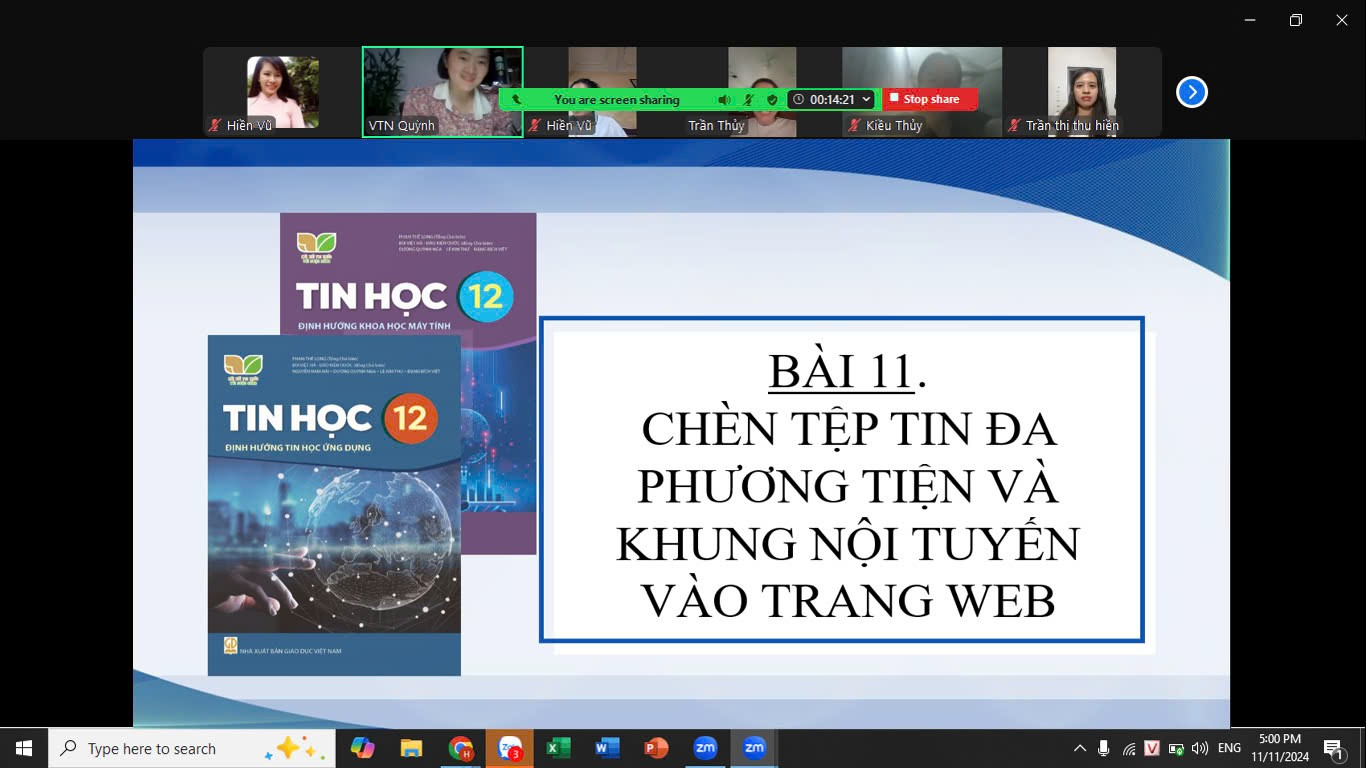 Nhóm Tin tổ chức sinh hoạt bằng hình thức online cho ý kiến đóng góp vào nội dung Bài 11: Chèn tệp tin đa phương tiện và khung nội tuyến vào trang web, SGK Tin học Lớp 12 - Kết nối tri thức. Đồng chí Vũ Thanh Hiền biên soạn và trình bày bài giảng. Đây là bài giảng có tính ứng dụng thực tiễn cao. Tuy nhiên, thực tiễn giảng dạy các thầy cô nhận thấy để giúp học sinh biết được các loại tệp đa phương tiện có thể chèn trên web và sử dụng ngôn ngữ HTML chèn được dữ liệu đa phương tiện và khung nội tuyến vào trang web và điều chỉnh kích thước cho phù hợp nhiều học sinh còn lúng túng. Để khắc phục hạn chế trên nhóm thống nhất trước khi giảng bài. Giáo viên phải yêu cầu học sinh tìm hiểu, chuẩn bị bài học trước ở nhà sau đó đến lớp thực hành. Giáo viên phải giao nhiệm vụ cho học sinh làm các sản phẩm liên quan đến bài học sau đó đến lớp trình bày. Qua đó, giúp học sinh khắc sâu, nhớ lâu kiến thức và làm được bài thực hành.