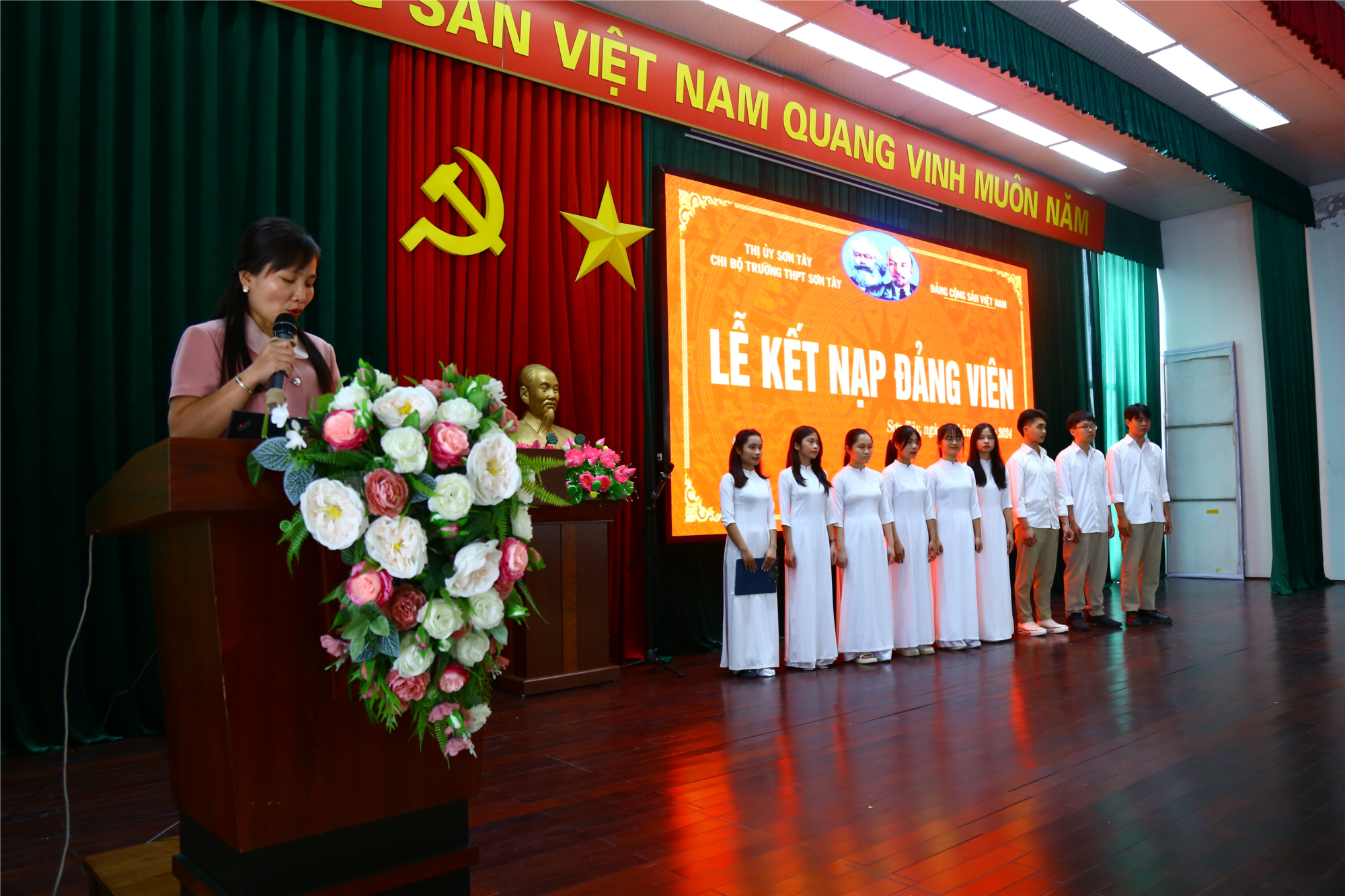 Tại buổi sinh hoạt chi bộ định kì tháng 6 vừa qua, ngày 3/6/2024, Chi bộ trường THPT Sơn Tây đã căn cứ vào Nghị quyết tháng 5 tổ chức kết nạp cho 9 quần chúng ưu tú là học sinh. Sau khi công bố quyết định kết nạp, đồng chí Phạm Thị Huyền – Phó Bí thư chi bộ và đồng chí Vũ Duy Khôi – Chi uỷ viên đã trao quyết định và tặng hoa chúc mừng 9 đồng chí đảng viên là học sinh. Tại lễ kết nạp, các đồng chí đảng viên mới đã đọc lời tuyên thệ và tiếp thu những nội dung về nhiệm vụ, quyền hạn của người đảng viên do đồng chí Phạm Thị Huyền nêu trước toàn chi bộ. Đồng chí Phạm Thị Huyền cũng nêu nhiệm vụ của chi bộ và phân công đảng viên chính thức tiếp tục giúp đỡ các đảng viên dự bị.